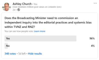 This is where Wellington needs to stop hiding. Yes, the Government has already leaned on TVNZ to improve trust levels – but the TVNZ response was the aforementioned ABC-linked whitewash and a carefully edited press release touting “no systemic bias”. RNZ answered criticism of its Gaza coverage with an internal report declaring itself compliant with its own policies.